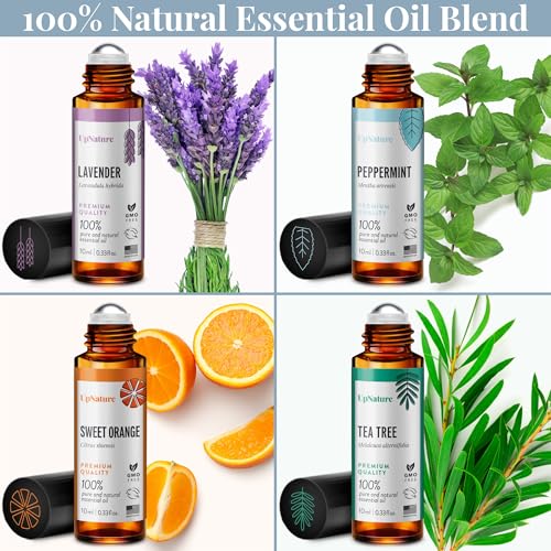 UpNature Top 4 Essential Oil Roll On Gift Set – Peppermint, Lavender, Tea Tree, Sweet Orange -Gift for Mom, Women & Men, Relaxing Gifts for Mom, Women & Men Essential Oil Set, Stocking Stuffer