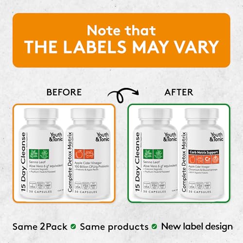 Youth & Tonic Colon Cleanser & Detox for Loss of Waste, Breaking The Plateau, Bloating. 60 Pills for Cleanse with Senna Leaf, Apple Cider Vinegar, Glucomannan and More