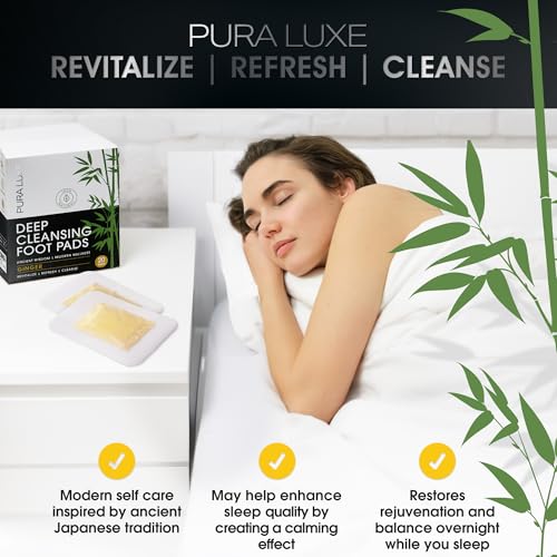 PuraLuxe premium deep cleansing foot pads enhance relaxation and support restful sleep. Made with natural bamboo vinegar and ginger powder, the aromatic herbal blend soothes tired feet while you sleep. Applied easily before bedtime and worn for 6-8 hours, these foot pads naturally aid in restoring your body’s equilibrium and vitality. Inspired by Asian traditions, the aromatic blend of pure ingredients works synergistically to soothe tired feet and contribute to overall well-being, ensuring you wake up feeling refreshed and rejuvenated.