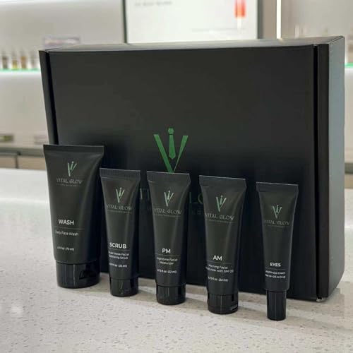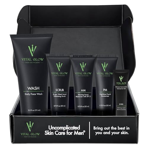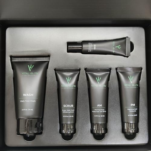 Essential Set: This comprehensive men’s skin care set includes a facewash, scrub, morning moisturizer, night moisturizer, and eye cream for complete daily grooming.