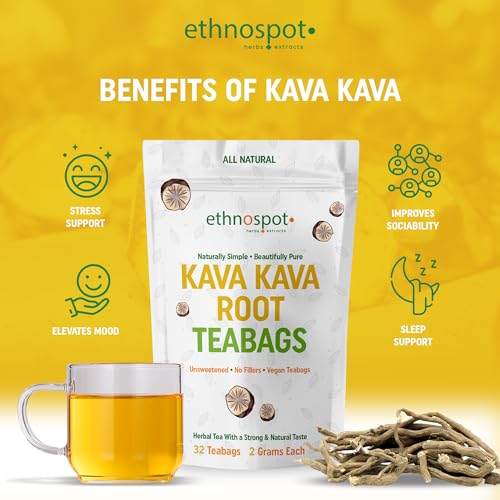 Kava Kava Root Teabags – Pure Kava Kava Tea – 100% Natural Herbal Tea For Stress Support Relaxation Improves Mood Assist Nervous System – Feel Happy Tea – 2 Gram Teabags – 32 Vegan Teabags