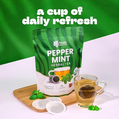 Tiger Organics, Peppermint Herbal Tea (100 Biodegradable Teabags) Supports Healthy Digestion & Promotes Relaxation | Your All-time Caffeine-free Infusion | USDA Organic Certified