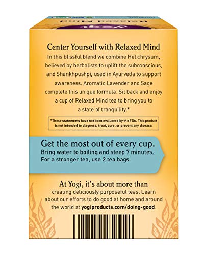 Find balance withRelaxed Mind Expand your mind and refresh your spirit with our fragrant Relaxed Mind. Yogi’s blissful blend begins with helichrysum, used in Western Herbalism for centuries and believed to uplift the subconscious. Then we add shank pushpi, used in Ayurvedic medicine to support cognitive functions, memory and perception. We finish this unique formula with aromatic English lavender and organic sage, herbs traditionally used to gently elevate mood and nurture creativity. The sophisticated taste of this one-of-a-kind tea may bring you to a state of pure relaxation and tranquility.*