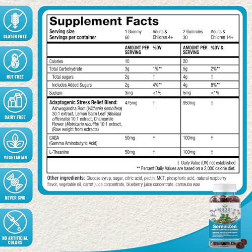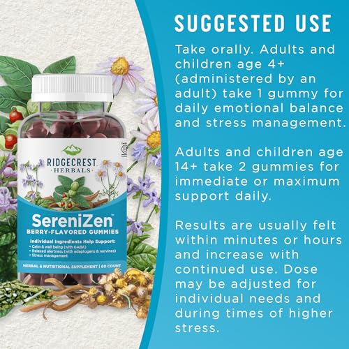 RidgeCrest Herbals SereniZen Gummies with Ashwagandha, GABA, L-Theanine, Chamomile & Lemon Balm, Supports Relaxation & Calm, Stress Management, Sleep. Daily Health Supplement, 60 Ct, 1-2 month supply