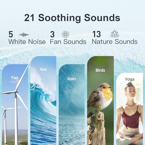 🌊 𝟐𝟏 𝐑𝐞𝐥𝐚𝐱𝐢𝐧𝐠 𝐒𝐨𝐮𝐧𝐝𝐬: Achieve your ideal sleep setting with 30 levels of volume control. Featuring 21 soothing sounds, including 5 white noises, 3 fan sounds, and 13 nature sounds such as sea waves, music box, rain, thunderstorm, bird chirping, wind, and more. Drift off easily into a deep sleep—perfect for those who have trouble sleeping.
