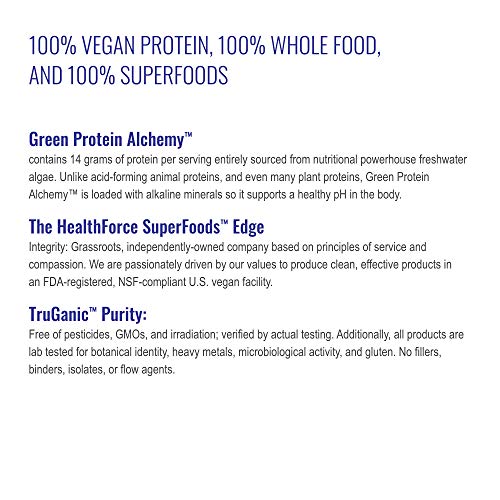 Green Protein Alchemy: Spirulina and chlorella superfood algae offer a full-spectrum array of cleansing and nontoxic vitamins, minerals, chlorophyll, and phytonutrients and are some of the most protein-dense foods on the planet! By combining Spirulina MannaTM and Chlorella MannaTM, super nutritious grasses, nopal cactus, and a vegan enzyme concentrate blend, Green Protein Alchemy seriously takes Vegan Protein to the next level. Free of binders, fillers, and excipients. Nothing but 100% potent superfood nutrition. Nothing but 100% Hard-Core. Available in powder. Highest Manufacturing Standards: Manufactured in the USA in an FDA registered facility. Recognized as NSF International/ANSI cGMP certified manufacturing standards. Made in an organic, kosher, gluten-free and vegan compliant facility.
