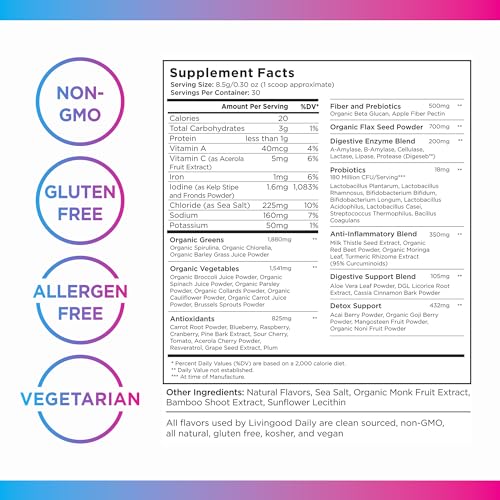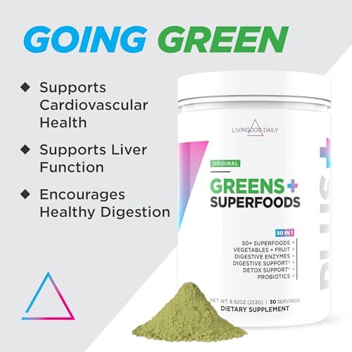 Going Green: Livingood Daily Original Greens + Superfoods combines the nutrients of a full dose of veggies and fruits with the antioxidant power of 50+ superfoods. This mix combines super greens, vegetables, antioxidant fruit, fiber, digestive enzymes, probiotics, liver support, heart support, digestive support, and detox all in one! 0.56 lbs