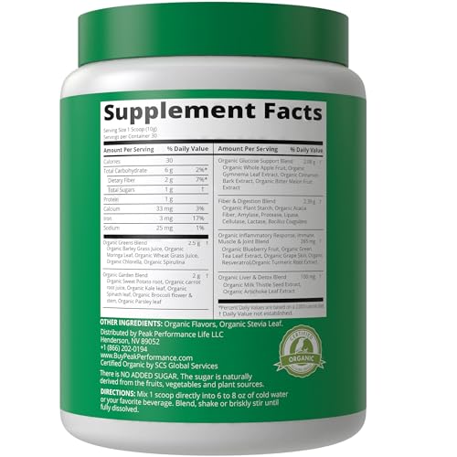 Peak Performance Organic Greens Superfood Powder. Best Tasting Super Greens Powder with 25+ Organic Ingredients for Max Energy and Athletic Performance. Vegan Keto Green Juice Daily Drink
