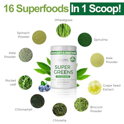 Teami Organic super greens powder for immunity & Digestion, Non-GMO Greens Superfood Powder to support energy, 16 superfood ingredients, Sugar-free Veggie powder for juice & smoothie, 32 servings
