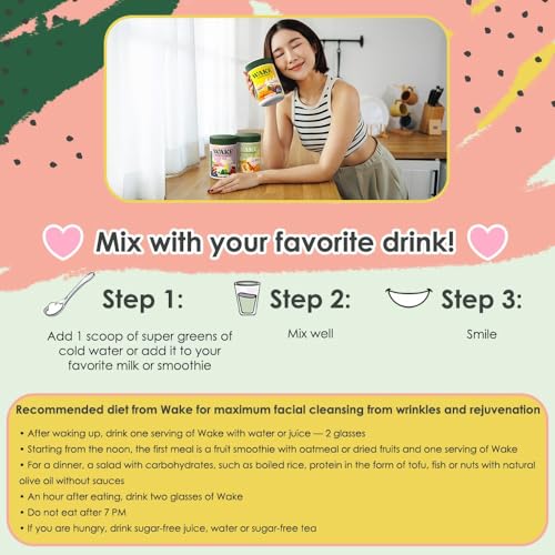 Wake Antioxidant Super Greens, Best Natural Powder Superfood, Spirulina & Chlorella, Vitamin B12, Non-GMO Vegan Drink, Juice & Smoothie Blend, Enzymes, Probiotics, Acai Berry & Camu Camu