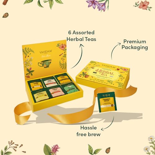 VAHDAM, Assorted Herbal Tea Variety Pack (6 Variants, 36 Tea Bags) Caffeine Free, Gluten Free, Non GMO | Eco Friendly Long Leaf Pyramid Tea Bags I Tea Gift Sets