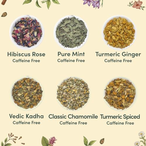 6 EXOTIC HERBAL TEAS – Embark on a sensory journey with our Herbal Tea Collection with warm Golden Turmeric Spice, invigorating Turmeric Ginger blend, fresh Pure Mint, tranquil Classic Chamomile, vibrant Hibiscus Rose and strong Vedic Kadha Herbal Tea. Each tea promises a premium, handpicked experience.