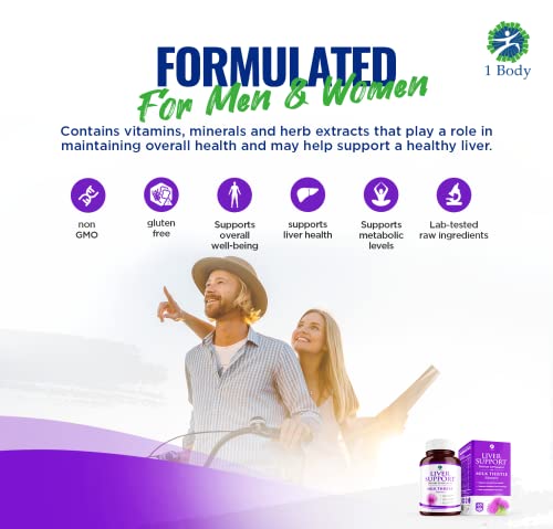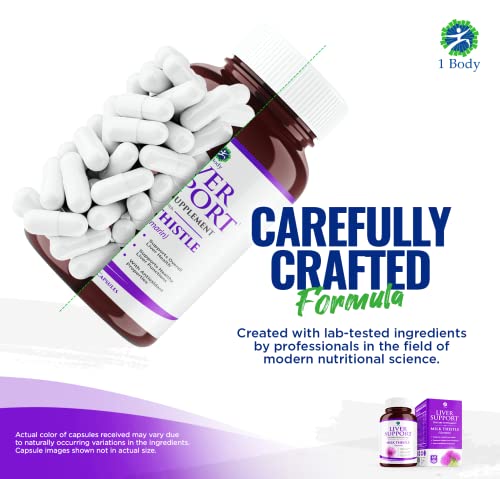 1 Body Liver Support Supplement – Liver Cleanse & Repair – Milk Thistle, Turmeric, Dandelion, Artichoke, VIT B12 & More – 60 Vegan Silymarin Capsules