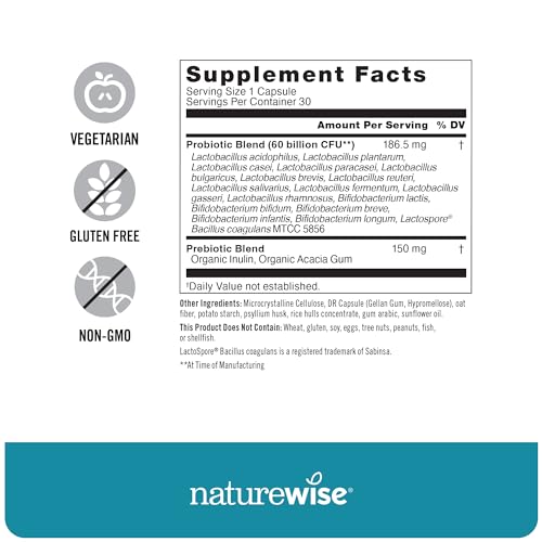 ![NatureWise Probiotics 60 Billion CFU - 17 Strains + Organic Prebiotics - Immune, Digestive & Gut Health Probiotic for Women & Men - Vegetarian, Gluten-Free, Non-GMO - 30 Capsules[1-Month Supply] - Image 4](https://m.media-amazon.com/images/I/51J0R6NlHoL.jpg)
