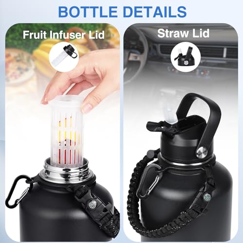 64OZ Insulated Water Bottle with Strap, Straw/Fruit Infuser Lid, Half Gallon Vacuum Insulated Water Flask Jug, Leak-proof Large Sports Jug for Outdoor Travel Camping Hiking Biking