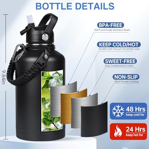 Dual Insulation and Exceptional Performance – This 1/2 gallon wide-mouth water bottle with double-wall vacuum insulation and stainless steel can keep drinks cold for 48 hours, hot for 24 hours, and preserve their freshness. Ideal for staying hydrated during hot summer days or camping trips