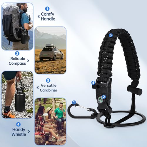 Distinctive Paracord Handle Designs – The versatile paracord handle complements the flask’s color and incorporates a compass, safety ring, carabiner, flint fire starter, and whistle. Unraveling it in emergencies transforms it into a robust rope, enhancing this large water jug’s utility as a survival kit for wilderness expeditions