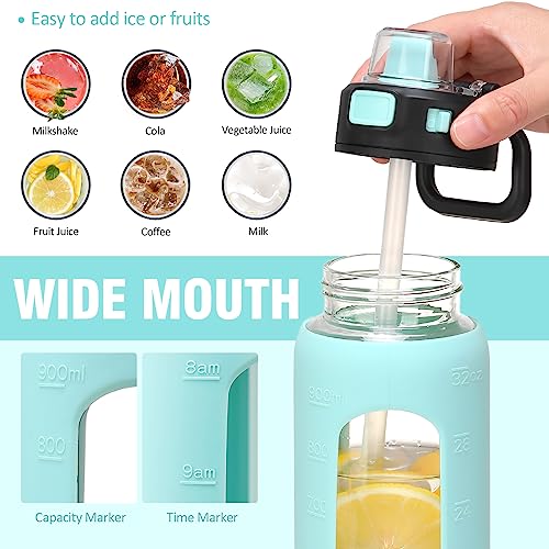 Kodrine Water Bottle with Soft Straw and Carry Loop, 32 oz Glass Water Bottle with Locking Lid, Clear Water Bottles Sports, Drinking Bottle for Travel Home Gym, Leakproof(Light Blue)