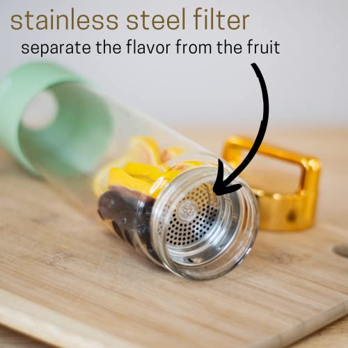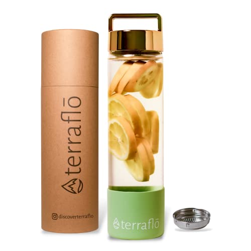 Terraflo Fruit Infuser Premium Glass Water Bottle 24 oz (700 mL) – Removable Anti-Slip Silicone Sleeve – Top Handle Lid – Stainless Steel Filter for Infusion – Infused Bottles for All (Gold & Green)