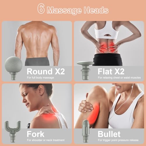 [6 Interchangeable Heads & Smart LCD screen]:Our massage gun comes with 6 massage heads, you can easily choose the right one according to different body parts and relaxation needs. The round one is for full body massage, the flat one is for relaxing chest or waist muscles, the fork one is for shoulder or neck treatment, and the bullet one is for trigger point pressure release. In addition, the LCD screen can help you intuitively observe the mode, speed level and battery life.